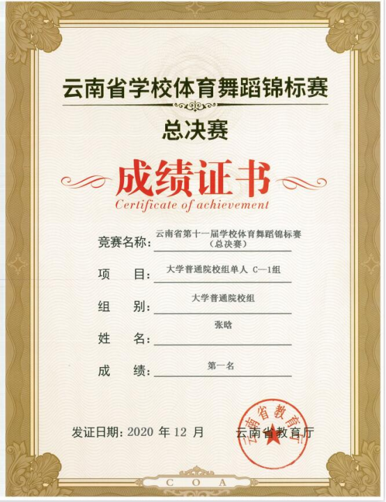 2020年12月26-31日云南省教育厅举办了云南省第十一届学校体育舞蹈锦标赛总决赛(线上),楚雄师范学院代表队在体育与健康学院陈灵芝老师及体操、小球教研室专业教师团队带领下,经过数月的刻苦训练在此次竞赛中,唐连、王春祝、李意如、常佐第、李平雪、何慧、杨珺淇同学荣获大学普通院校组集体项目6人校园牛仔第一名、6人校园恰恰恰第二名、6人3级单人组合拉丁第二名、6人校园维也纳华尔兹第五名。张晗同学荣获单人项目单人恰恰第一名、单人3项拉丁第二名、单人伦巴第四名等多个奖项。此次竞赛充分展示了楚雄师范学院学子努力拼搏的进取精神和青春朝气的艺术风采。