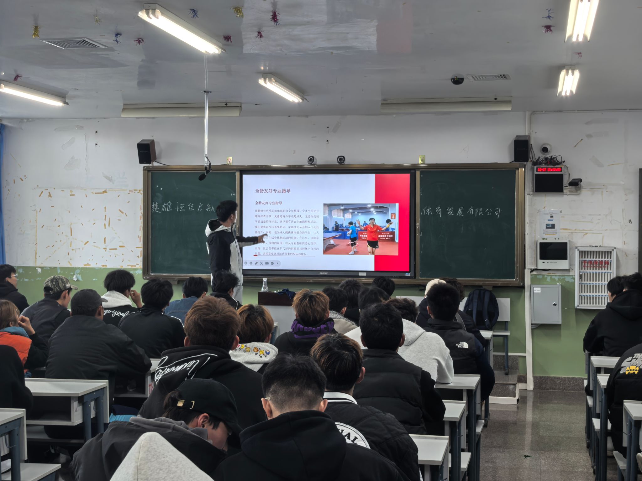 为进一步拓宽我院毕业生就业渠道,搭建校企合作与人才对接平台,12月17日15:00,楚雄恒佳体育培训学校有限公司专场招聘会在我院笃学楼118教室顺利举办。本次招聘会由我院优秀校友、楚雄恒佳体育负责人杨国主讲,吸引了大三、大四社会体育指导与管理专业百余名意向就业学生到场参与。